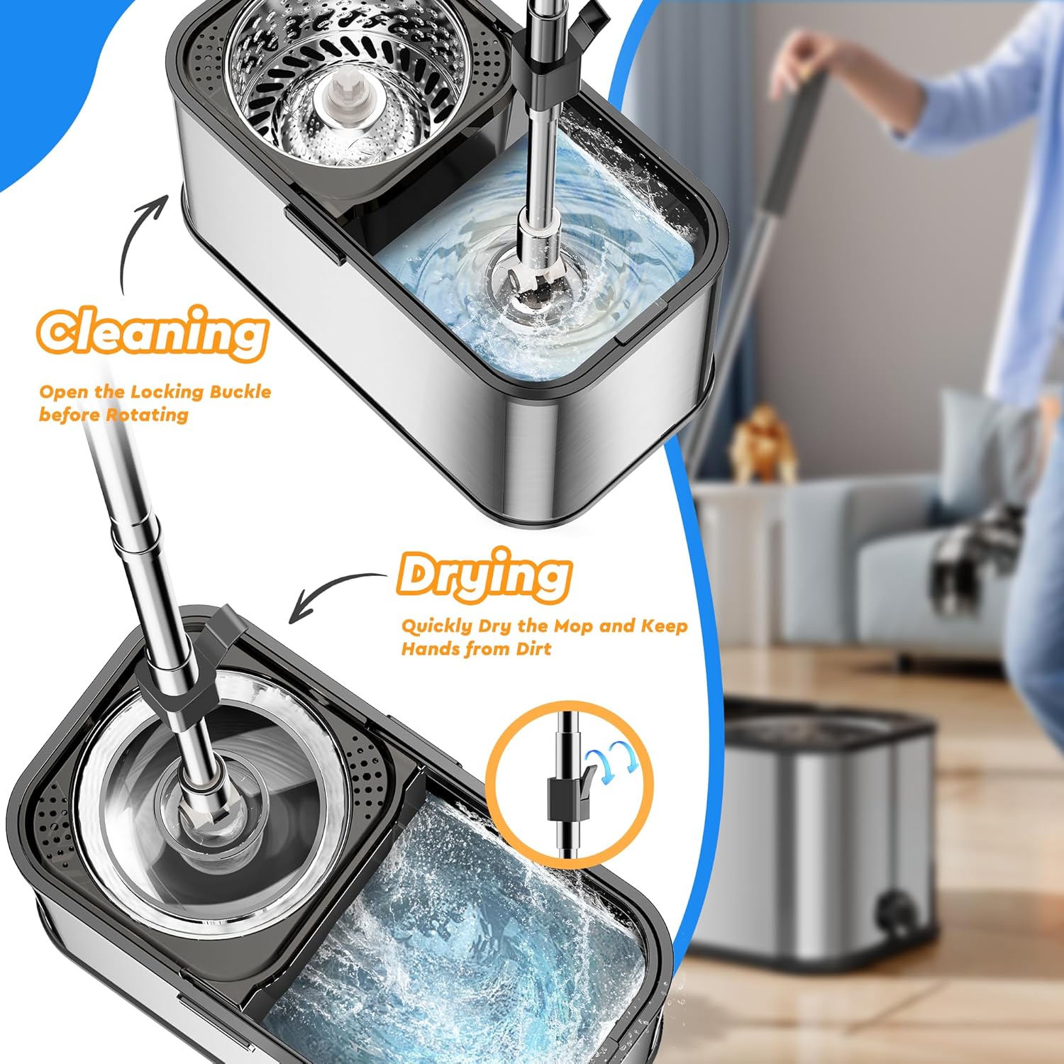 • Spin Mop and Bucket Benefit: Spin mop and bucket made of high quality stainless steel, stronger spin wringing performance than those work with pedal, so the mop head wrings drier, save efforts and is more durable. You don’t have to spend as much energy to get the mop head to spin.