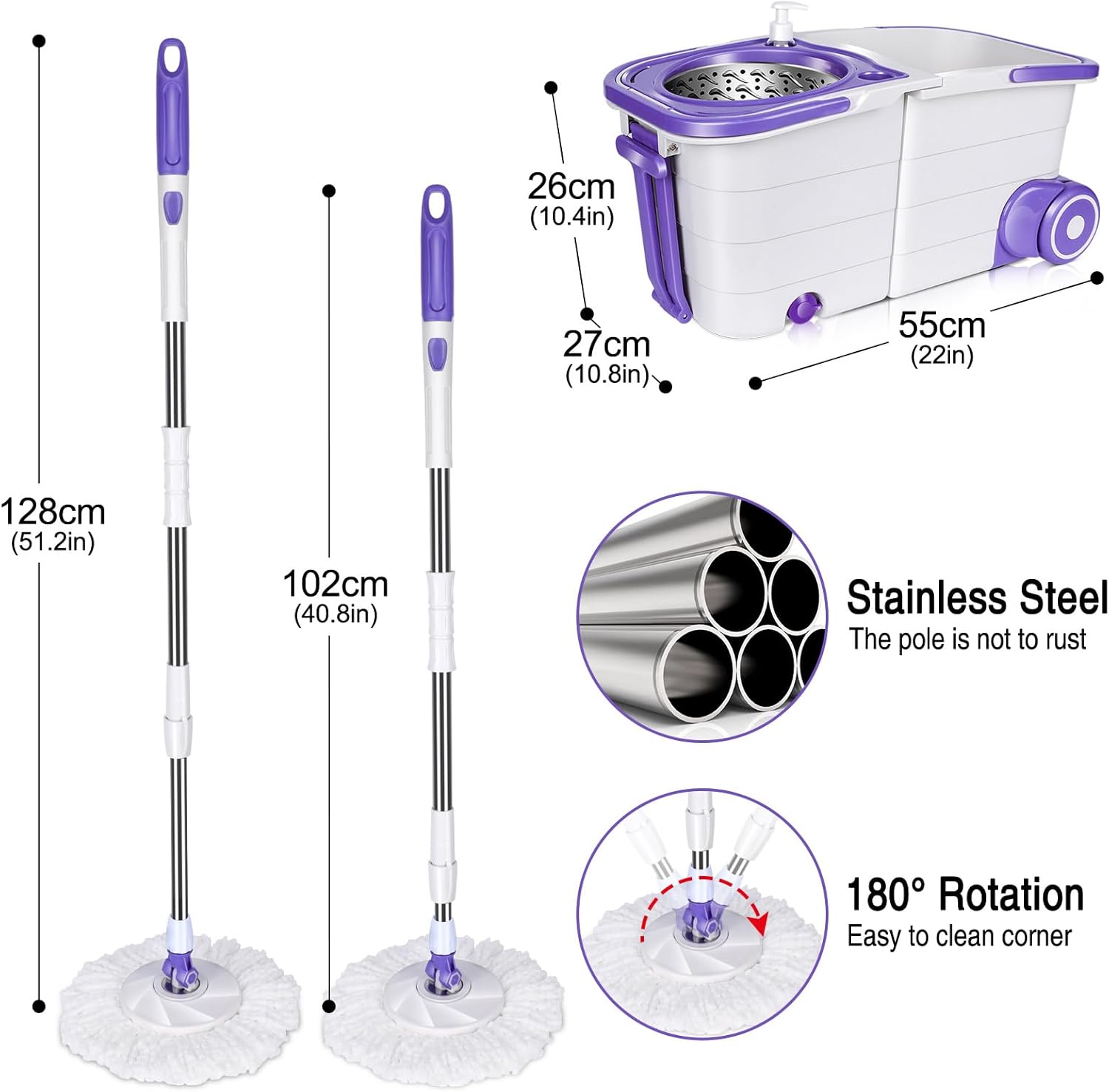 • SUITABLE FOR MULTIPLE SURFACES: Our floor mop is suitable for all smooth floor surfaces including wood, laminate, marble, tile, vinyl and more. The telescopic handle can be extended from 40.8 inches to 51.2 inches in length to accommodate people of different heights. If you have any questions about the item, please click “Contact Seller” and we will provide you with a solution as soon as possible.