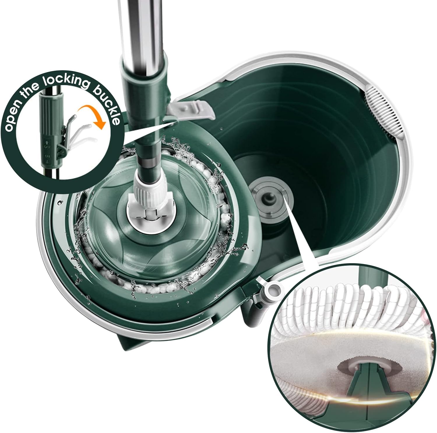 - 360° Rotating Mop Head:The 360 degrees spin mop is easy and flexible to reach to difficult places, under the furniture, behind the toilet and corners. Handle length can adjust from 36 up to 48 inch. The built-in bucket can splash water into the bucket not on the ground when cleaning and wringing.