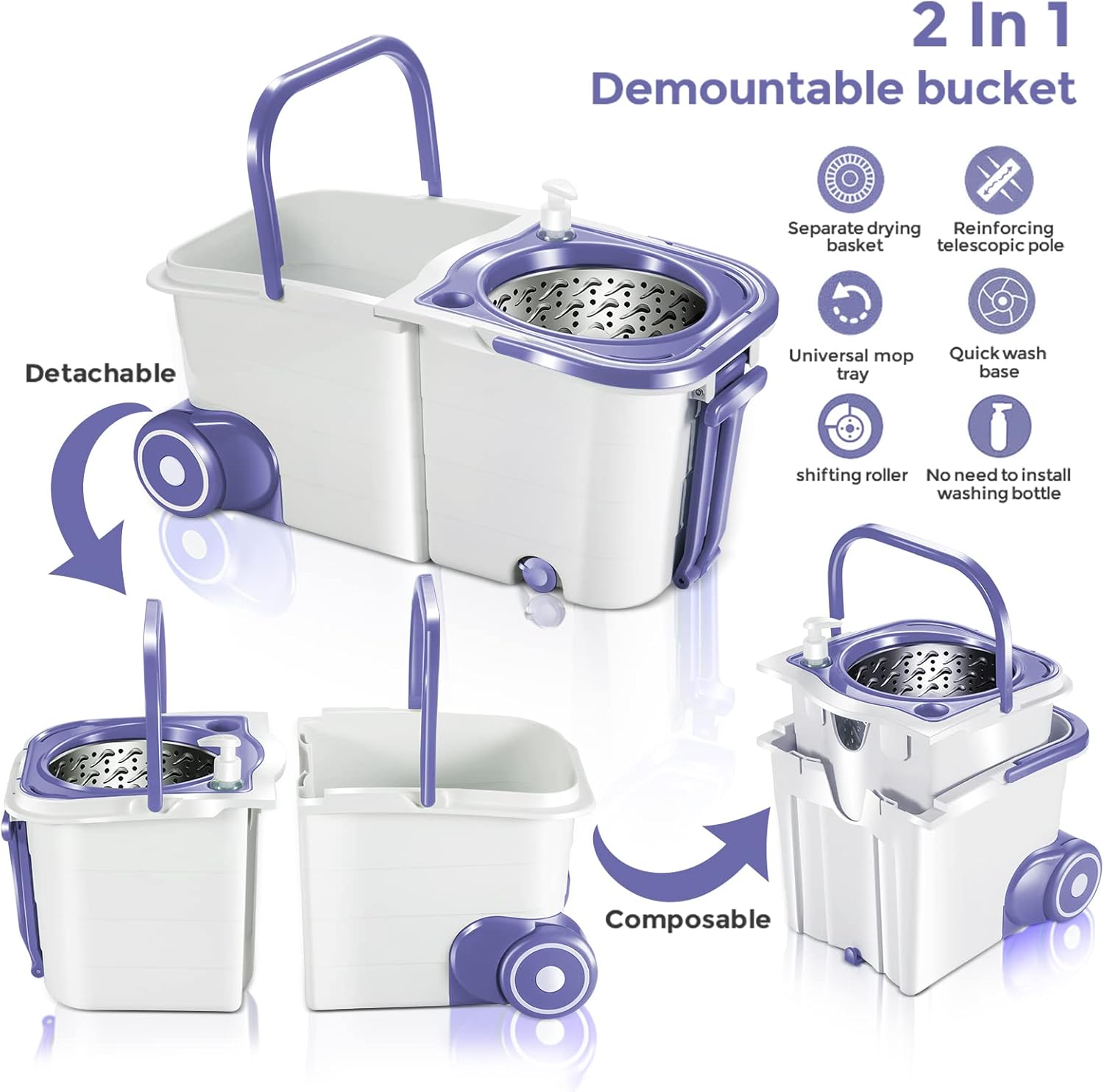 - 2 In 1 Demountable Bucket: The spin mop and bucket can be detachable and composable, you can use these two buckets wisely according to your needs. This spin mop bucket are made of durable stainless steel and PP, the telescoping handle is made of durable stainless steel, is durable and sturdy to use.
