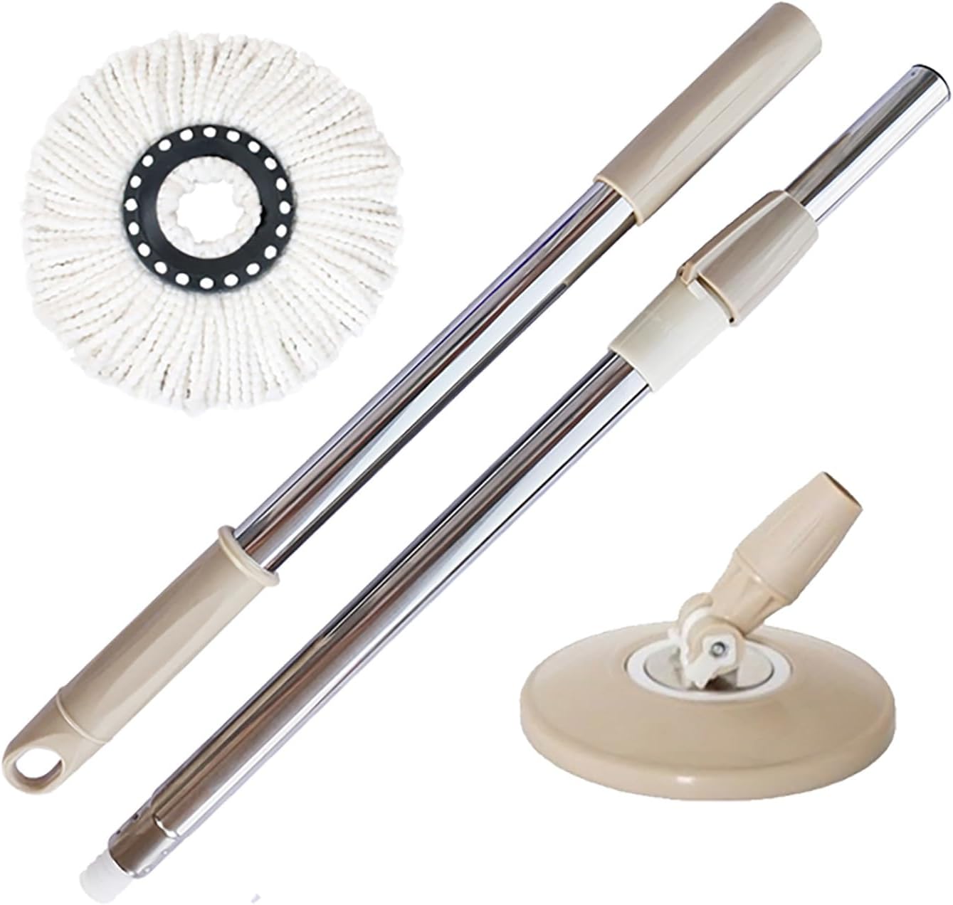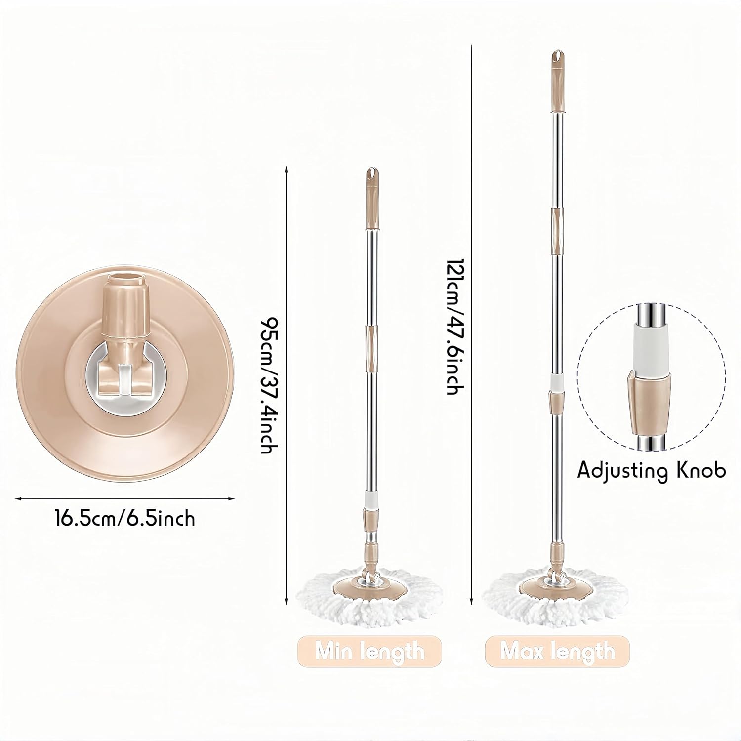 - Suitable Sizes: The spin mop pole replacement has an outer diameter of 6.5 inches/16.5 cm and inner diameter of 6.3 inches/16 cm. Fully extended it is 47.6 inches/121 cm. Fits most spin mops including 363 degree spin round mop